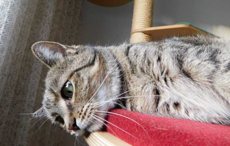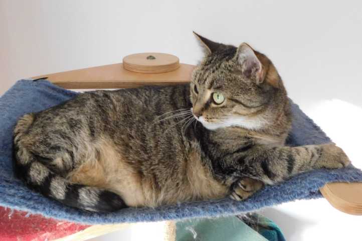 Becky auf ihrem Lieblingsschlafplatz, der Hängematte des Kratzbaums. Vorgestern ist sie untergeplumpst. :shock: Anschließend humpelte sie kurzfristig. Aber ich denke, daß nix Ernsthaftes passiert ist.
